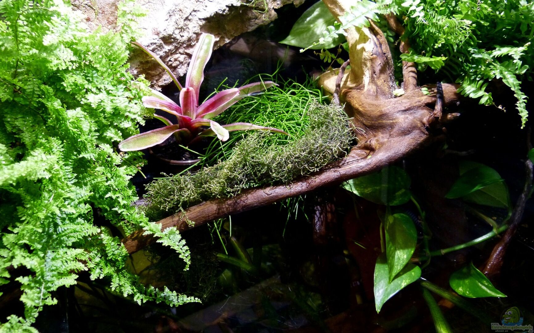 Emers: - Viresea Dorado Bromelia - Neoregelia Bromelia - Rhipsalis cassutha - Nephrolepis vitale - Nephrolepis Green Lady - Hedera helix - Epipremnum pinnatum - Moos *hier werde ich schauen was funktioniert und was nicht :-) Submers: - keine Bepflanzung