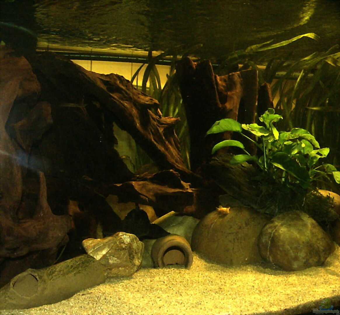 Sicherheitsüberläufe rechts und links hinten (waren ursprünglich für externes Filterbecken gedacht und in falscher Abmessung gebohrt) Der Unterschrank ist ein Holzaufbau und an der Front geschlossen, da die Becken demnächst eine Verkleidung bis zur Decke erhalten sollen. Das Becken steht erst seit Anfang Januar. Die Rückwand musste ich nach 2 Monaten wieder entfernen, da die Baryancistrus anfingen die obere Schicht abzufressen.