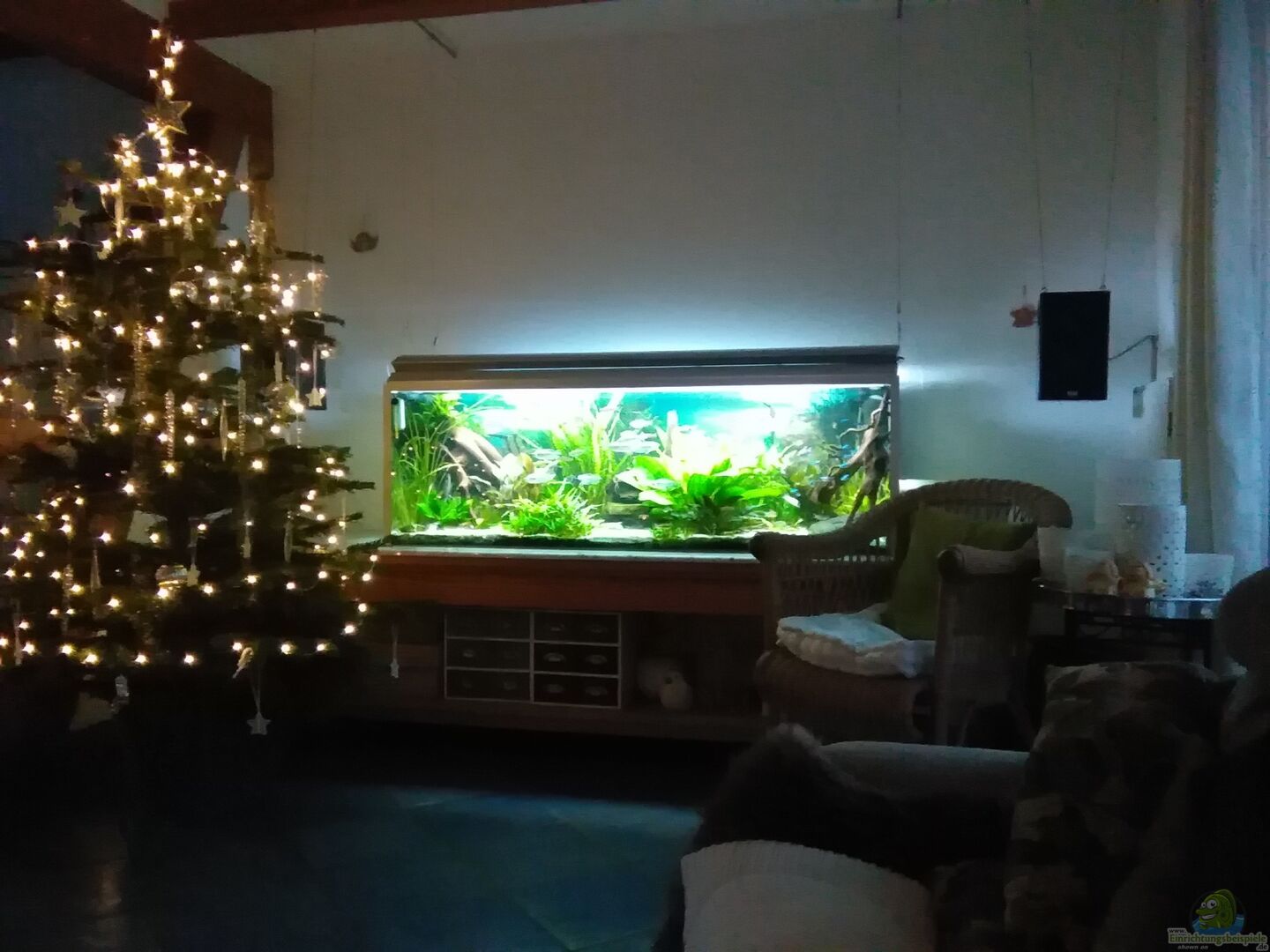 Juwel-Becken, 8 mm Float-Glas, Bodenscheibe 10 cmm Verkleidet von uns mit L-Aluschienen zur besseren Optik auf selbst gezimmertem Tisch, Filter stehen rechts und links