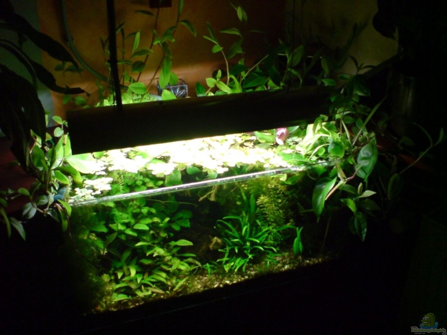 Das Becken ist offen und steht auf einem selbst gebauten Unterschrank. Bis August 2007 war das Aquarium mit einer Scheibe abgedeckt, hatte eine 15W Leuchtstofflampe, bekam kein CO2 eingeleitet und wurde, au??er über das Futter, nicht gedüngt. Ging auch, war aber nicht so schön.