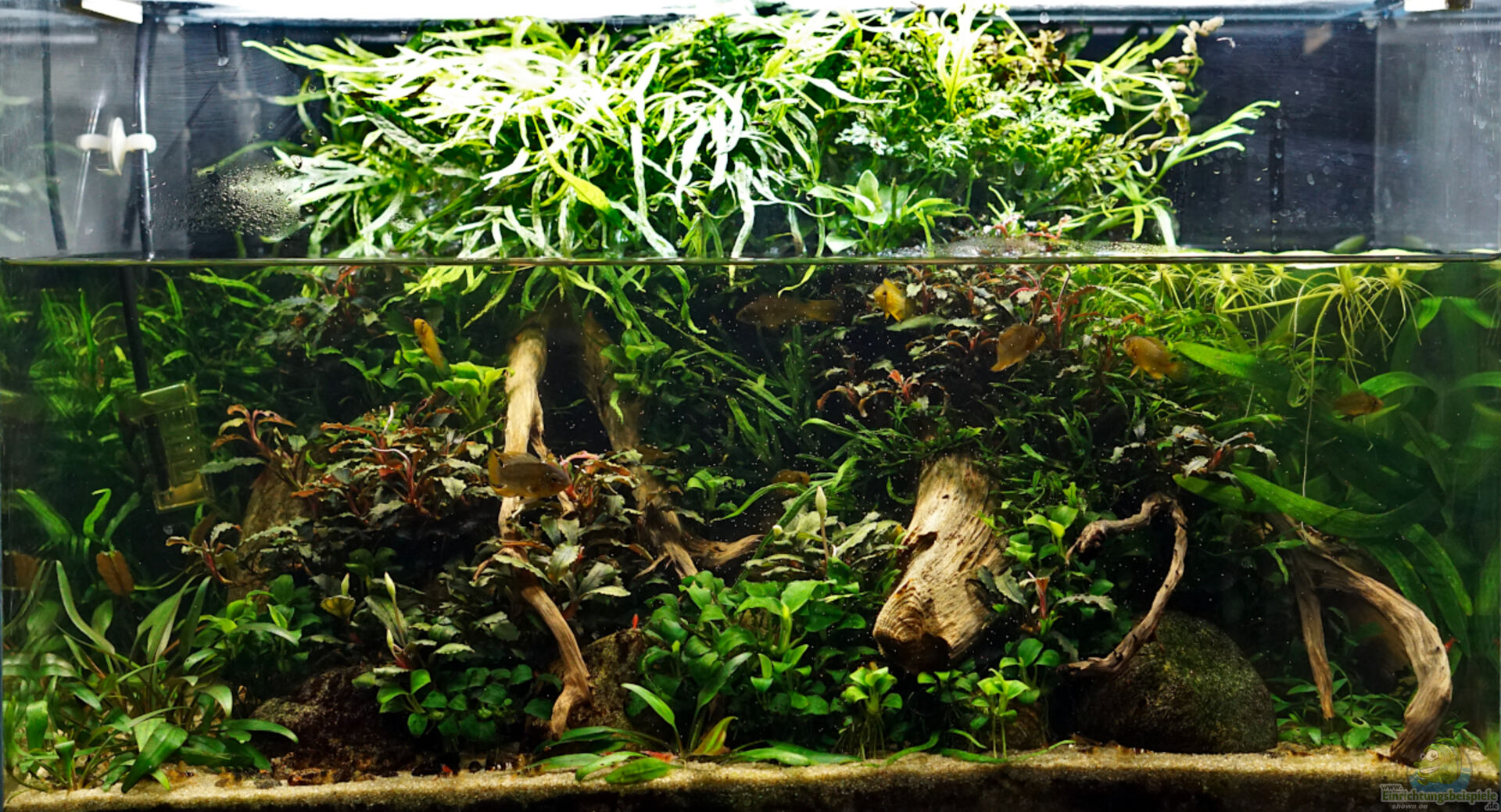 No-Name Becken mit transparenter Verklebung in Poolbauweise. Das Becken ist nur zu etwa 3/4 mit Wasser gefüllt und hat einen kleinen emersen Teil.