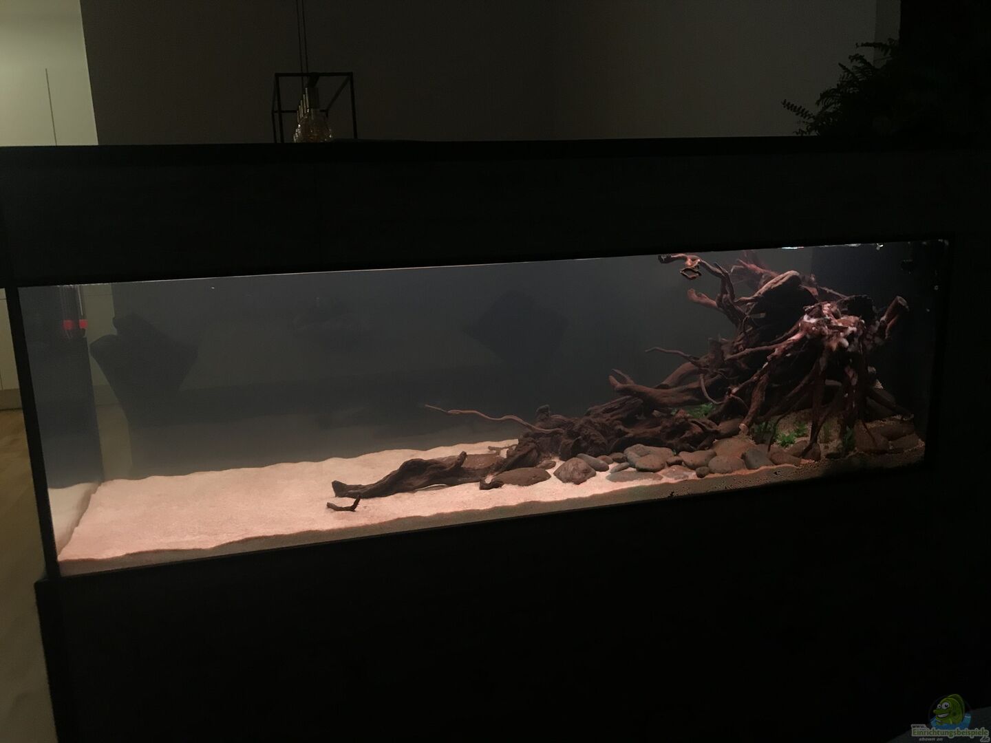 Selbstgemachter Raumteiler mit einem Glasbecken der Ma??e 150x50x50. Der Raumteiler wurde aus Leimholzplatten gebaut und mit Parkett und Zierleisten verkleidet.
