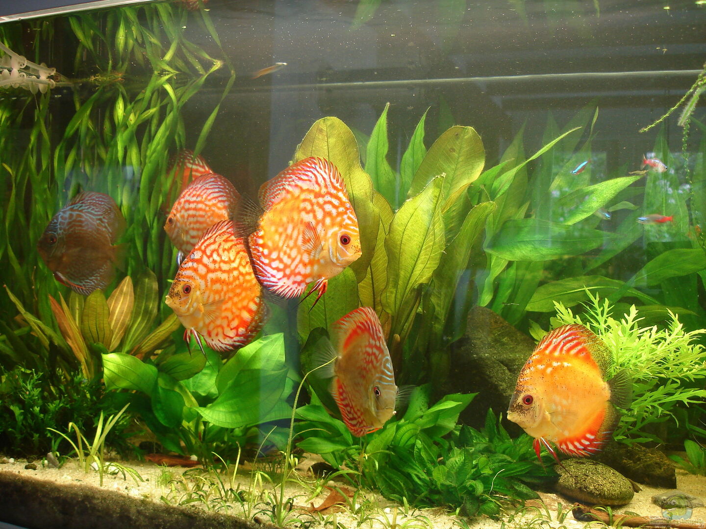 wechselnd Diskusfische, leider war das Mobbing sehr gro??, sodass zu Schluss nur noch 1 Paar übrig blieb, dann nur noch das Weibchen. Dann habe ich umgestellt auf Skalare u.a. Diverse Beifische, wie Neons, Corydoras, 3 Sturisome und Rotkopfsalmler
