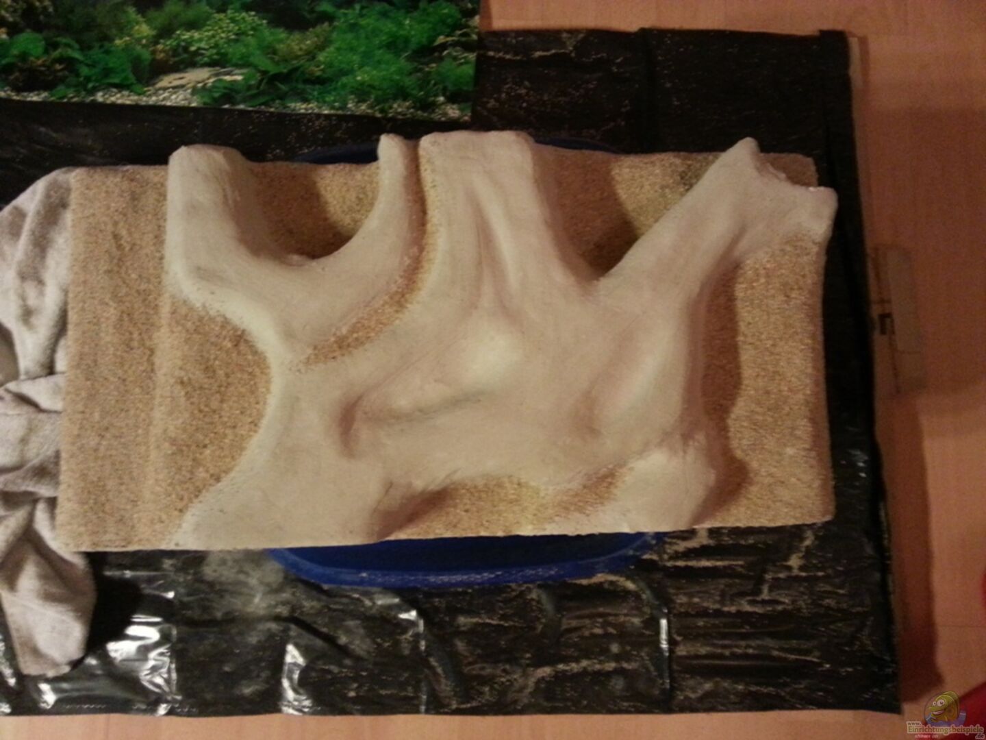 Rückwand selber gebaut mit Höhlen und hinter schwimmbar 2 x Tonröhren 3 x Wurzeln 1 x Lochgestern