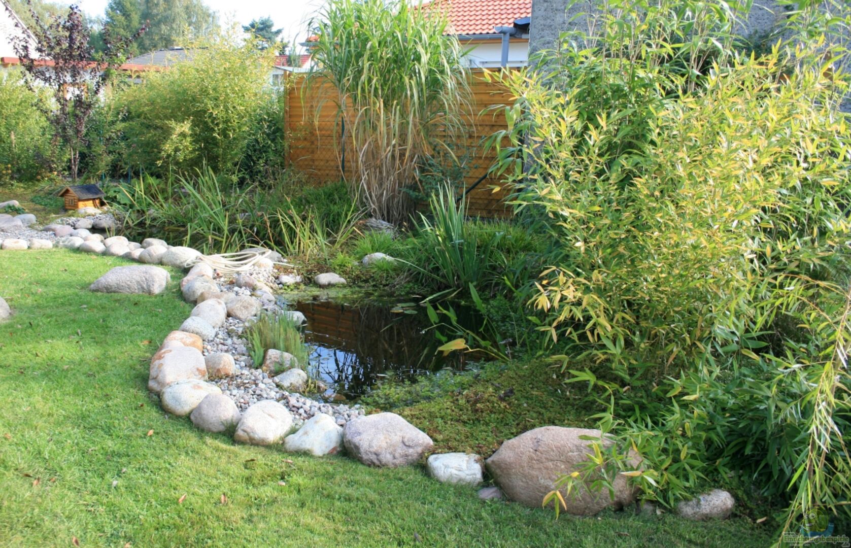 Es handelt sich hier um 4 Gartenteiche. Die beiden Fertigteiche haben ein Fassungsvermögen von ca.2000l und 3000l. Der Folienteich wird über die Dachentwässerung vom Haus mit Regenwasser gefüllt. Es gibt dann auch noch über Rohre eine Verbindung zu den Fertigteichen. Im Frühjahr folgen weitere Fotos, im Moment sind die Teiche mit Netzen abgedeckt.