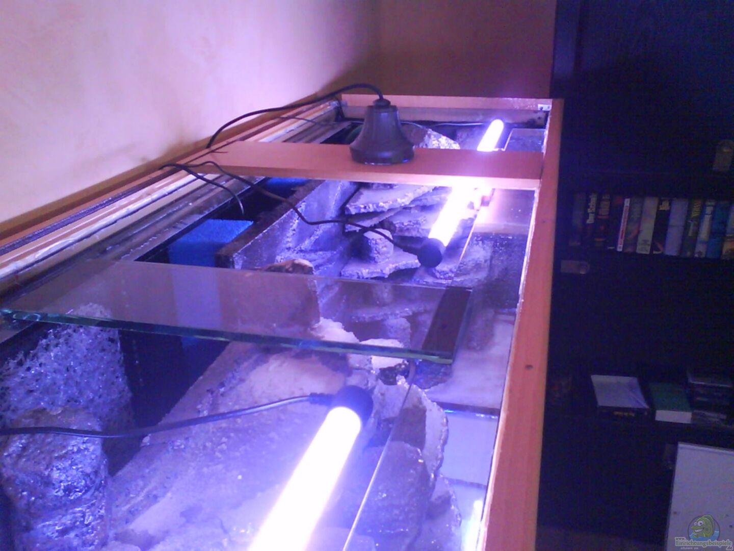 2 eheim 200w heizstäbe in den filterkammern (inaktiv - die beiden pumpen heizen das becken genau passend) 1 externes thermometer sowie ein externes ph-meter, beides im dauerbetrieb eigener wasseranschluss mit mischwasserventil für die passende temperatur beim wasserwechsel.... eigener wasser ablauf zum wasser entnehmen hinter dem aufbau in der mitte, also zwischen den beiden filtereingängen, ist eine spagettimatte 20x4x40 eingegossen welche jungtieren vorübergehend schutz bieten [...]