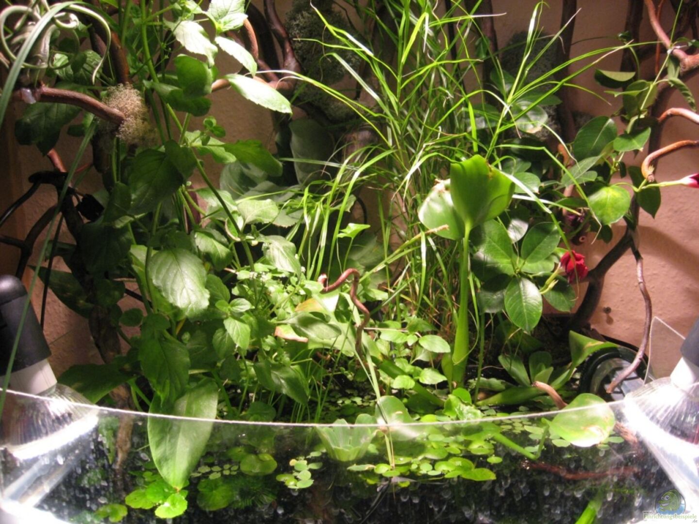 Offenes Aquarium mit viel Bepflanzung oberhalb des Wasserspiegels. Die vier Filterkästen hinter dem vorderen Aquarienbereich sind nicht mit Wasser gefüllt sondern werden als Pflanzkästen genutzt. Au??erdem befindet sich rechts vom Aquarium ein weiterer Pflanztopf mit Bepflanzung. Als Aufbau befinden sich über dem Aquarium Weidenäste, welche mit Flechten und Orchideen bepflanzt sind.