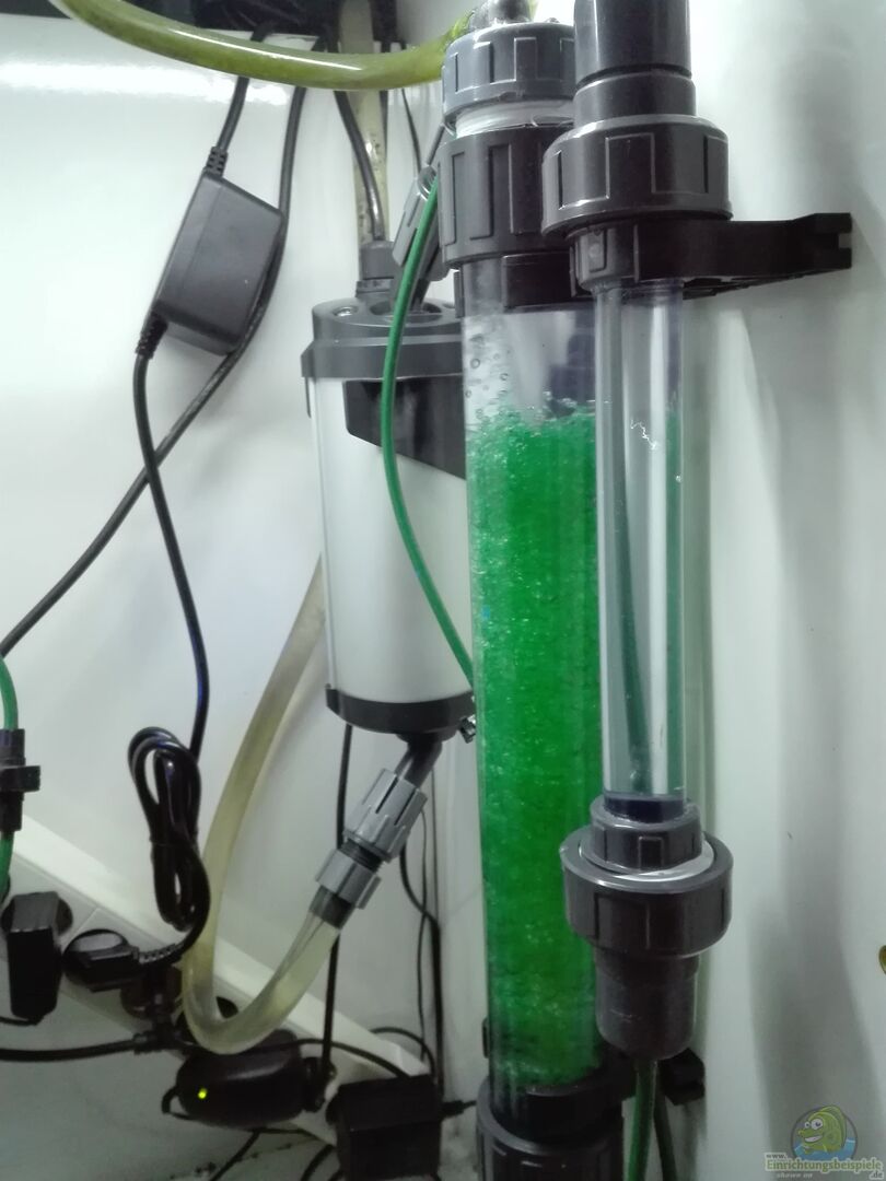 Heizung befindet sich in der ersten Filterkammer. Das Wasser aus der Klarkammer wird durch eine CompactON+ 2100 ins Hauptbecken zurück geleitet. 2 Absperrhähne und ein Rückschlagventil habe ich noch dazwischen gesetzt. CO²-Anlage von Dennerle mit Druckminderer ???Space??? und 2kg Buddel Das CO² wird mittlerweile durch eine Glaspfeife eingeleitet, weil es doch effizienter ist. Zumal sich die aufgestiegenen Gasperlen in den Wurzeln vom Froschbiss ansammeln und gelöst werden.