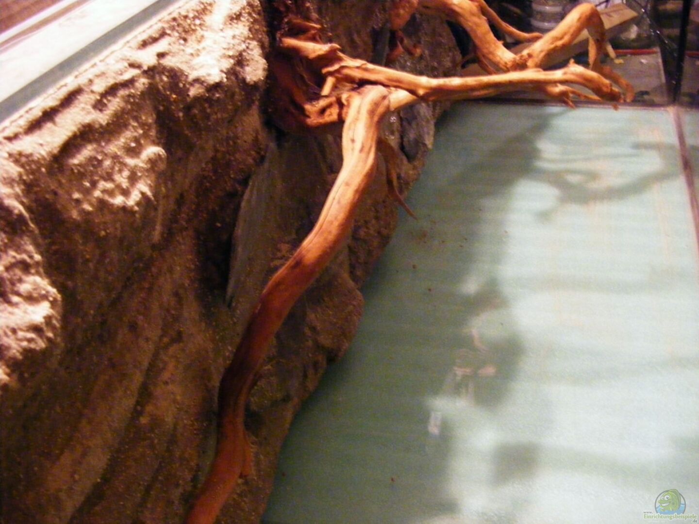 Rotholzwurzeln Sumpfholzstücke Korkrinde Granitsteine SeemandelbaumLaub/Seemandelbaumrinde Buchenlaub Eichenlaub Es wurde eine Schilfzone mit Phragmites australis-Fragmenten eingebracht, bestehend aus ca.35 Fragmenten, davon drei , die lebend gezogen werden umd später die "toden" wechseln zu können. Salix matsudana, die aus Herbstschnitt angefallen sind , diese werden ebenfalls lebend gezogen. Dies ermöglicht eine besondere Atmosphäre im Becken durch die Darstellung [...]