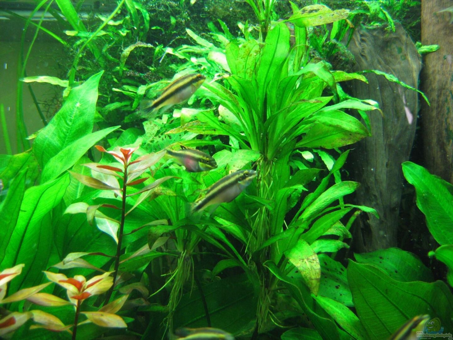 Derzeit im Becken sind: Vordergrund - Sagittaria subulata als Bodenrasen - Perlkraut - helles Kraut mit unbekanntem Namen Mitte bis hinten - Cryptocorynen kl. und mittlere Unterart - Echinodoren mehrere Unterarten bis hinten - Rosalla (rot) - Ludwiglie (rot) - Lotus (rot) - Tausendblatt - 2-3 unbekannte Arten Hinten - kleine Valisnerien, Wasserhyazinthe - Kirschblatt - indischer Wasserstern Seite/ Filterabdeckung - Javafarn, -moos - Anubias in den Wurzeln [...]