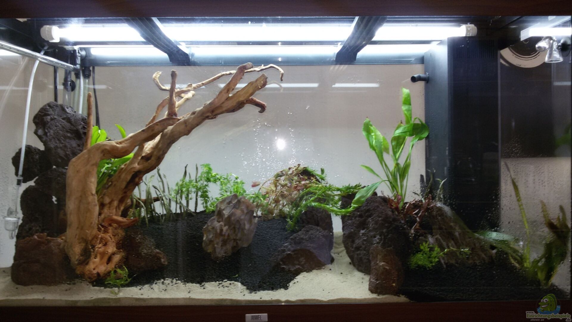 Das Hardscape wurde primär aus Islandlava/Drachenstein und Moorwood gestaltet. Die Lava wurde auf der linken Seite so angeordnet, dass diverse Versteckmöglichkeiten entstanden sind. Auf der rechten Hälfte des Beckens wurde eine kleine Schlucht aus der Lava gestaltet und darüber eine Wurzel platziert, damit auch hier ein Unterstand für meine Bewohner vorhanden ist. Durch den Einsatz von Sand, Schieferplatten und diversen Kleinkram, ist unter dem Innenfilter eine weitere Bruthöhle entstanden. [...]