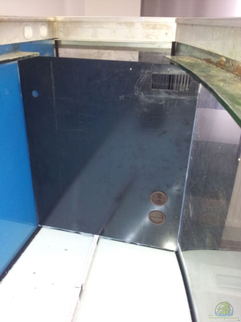 Aquarium 200x60x60cm mit gebogener Frontscheibe. Abdeckung und Unterschrank waren original in Nussbaum Farbe was aber Anfang 2012 in weiss Hochglanz umlackiert wurde. Selbst gebauter Technikteil im Becken mit ??berlaufkamm, Kammerfilter, Abschäumer und Rückförderpumpe.