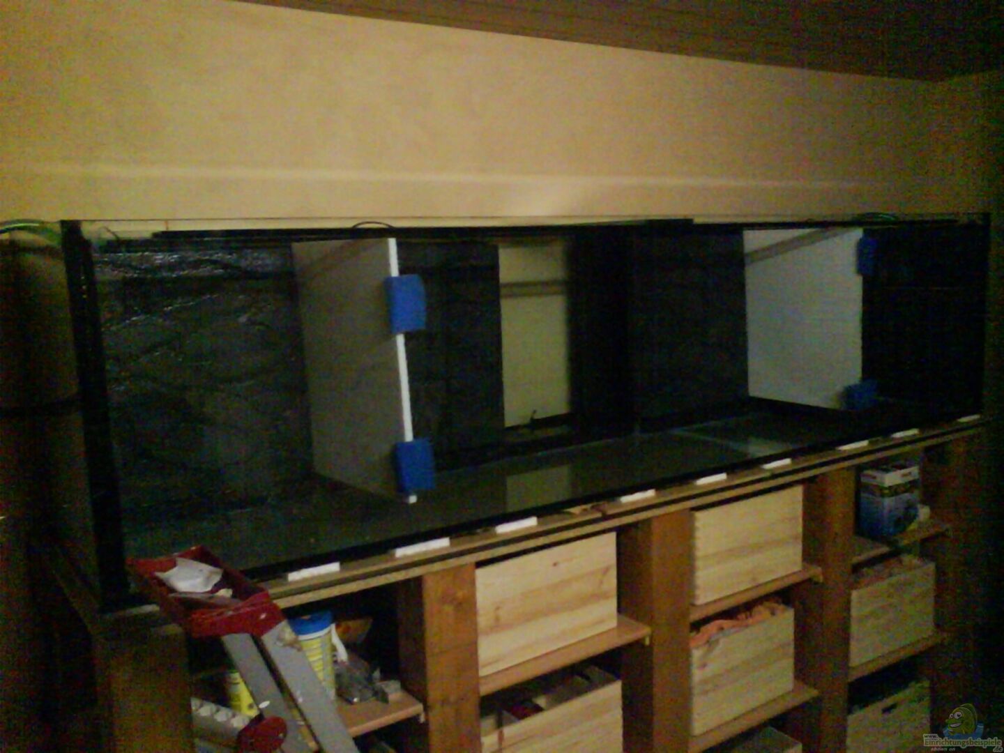 bis auf die verklebung des glases ist alles eigenbau: -abdeckung + beleuchtung -seiten-rückwand + 2 bio-innenfilter -steinaufbauten (selbstgebaute steine) -unterschrank 1m hoch!!! -eigener wasseranschluss + ablauf Es handelt sich hierbei um ein gemeinschaftsprojekt mit meinem vater