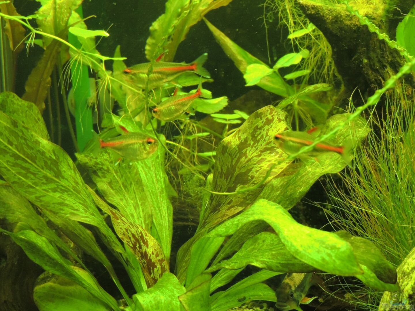 Fische: 2 (m/w) Ringelhechtlinge 7 Glühlichtsalmler 5 Sternflecksalmler 2 (w/m) Kakaduzwergbuntbarsch 2 LDA 67 2 (w) roter Hexenwels 3 Ohrgitterharnischwelse (werden nicht mehr aufgestockt) Wirbellose: 9 Geweihschnecken Hinweis: Ich wei??, dass die beiden Salmlerarten jeweils im Schwarm gehalten werden müssten. Die Glühlichter genie??en ihre Rente. Später sollen dann die Sternflecksalmler auf 10 oder 12 aufgestockt werden.