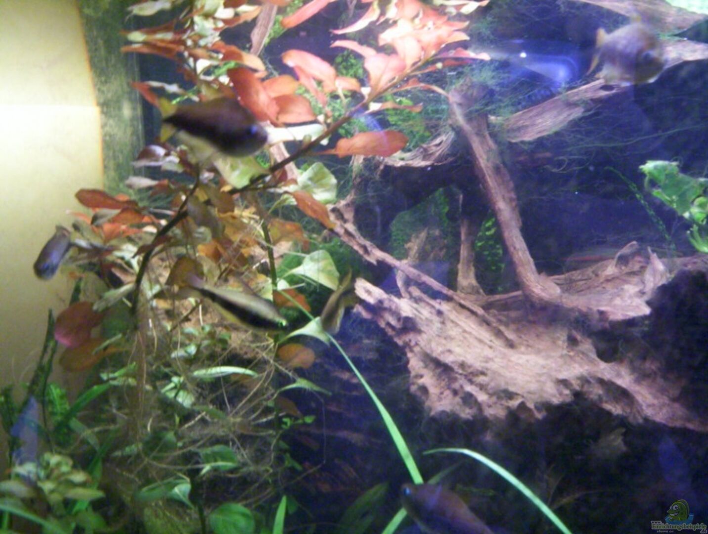 1 Mangrovenwurzel (85 x 25 x65 cm von AMTRA) 1 Mopaniwurzel mit Anubias nana bewachsen aus meinem 112 Liter Becken 2 Resin (Kunststoff) Höhlen für die Perlhuhnwelse 1 Juwel Strukturrückwand als Abdeckung für den Dreikammerfilter