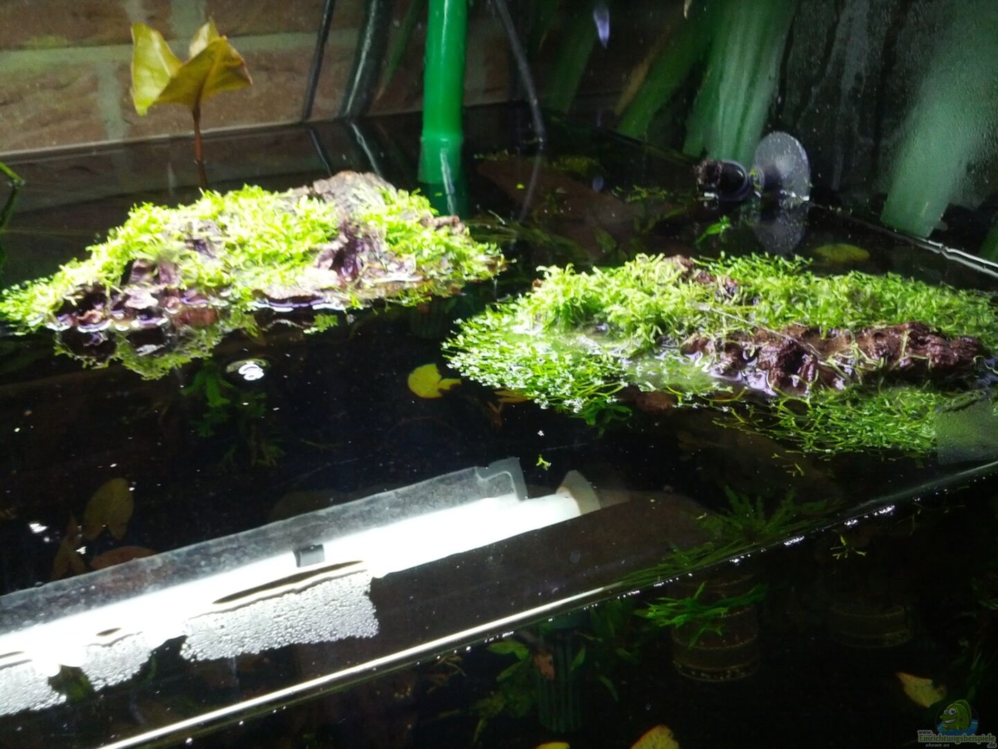 Dominiert wird das Becken von 2 grossen Wurzeln welche optisch zu einer zusammengefasst sind. Diese sind mit den Anubia und Javafarn dicht bepflanzt, wodurch diverse unterschiedlich dunkle Höhlen entstehen die gerne angenommen werden. Die Seiten werden von einigen dicken Steinen und diversen kleineren Holzstücken flankiert welche ebenfalls mit Javafarn bepflanzt sind. Die Hauptwurzel ist oberhalb der Wasserlinie mit Moos(aus dem Garten) bepflanzt. Des weiteren treiben an der Wasseroberfläche [...]
