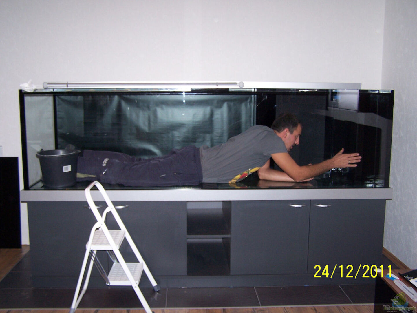 Mein Aquarienbauer Becken ins eine Sonderanfertigung auf meinen Wunsch von der Firma Aquarienbau Geschwill in Hassloch und Wurde mir am Morgen vom 24.12. geliefert. Das Becken ist aus 15mm dickem Glas geklebt. Die Front und linke seite Scheibe ist aus Wei??glas, die zwei anderen aus normalem Glas. Die beiden Filter sind aus Schwarzglas. Bodenplatte geteilt und mit 15cm breitem streifen überklebt. Die Ecken sind mit zusätzlichen glasstreifen verstärkt. Rückwand beklebt mit Matt Schwarzer [...]