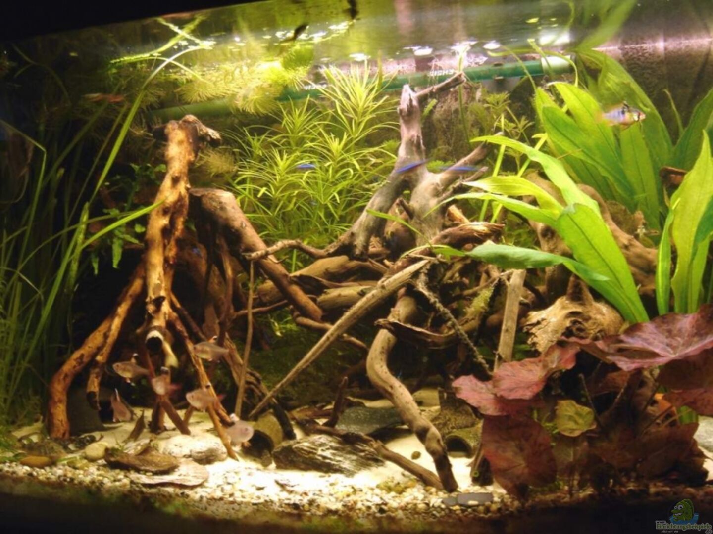 zwei Mangrovenwurzeln in den Ecken vor den Filteransaugrohren zwei gro??e filigrane Moorkienwurzeln in der Mitte jede Menge kleine, filigrane und verzweigte Moorkien-hölzer, -wurzeln und -zweige welche zusammen- und aneinander gestellt wurden um einen tropischen Flu?? mit Fallholz darzustellen. diverse Steine wie Flusskiesel und Pagodensteine viele Tonhöhlen und Röhren und umgedrehte Blumentöpfe als LAichhöhlen für die Welse und Zwergbuntbarsche einige Seemandelbaumblätter