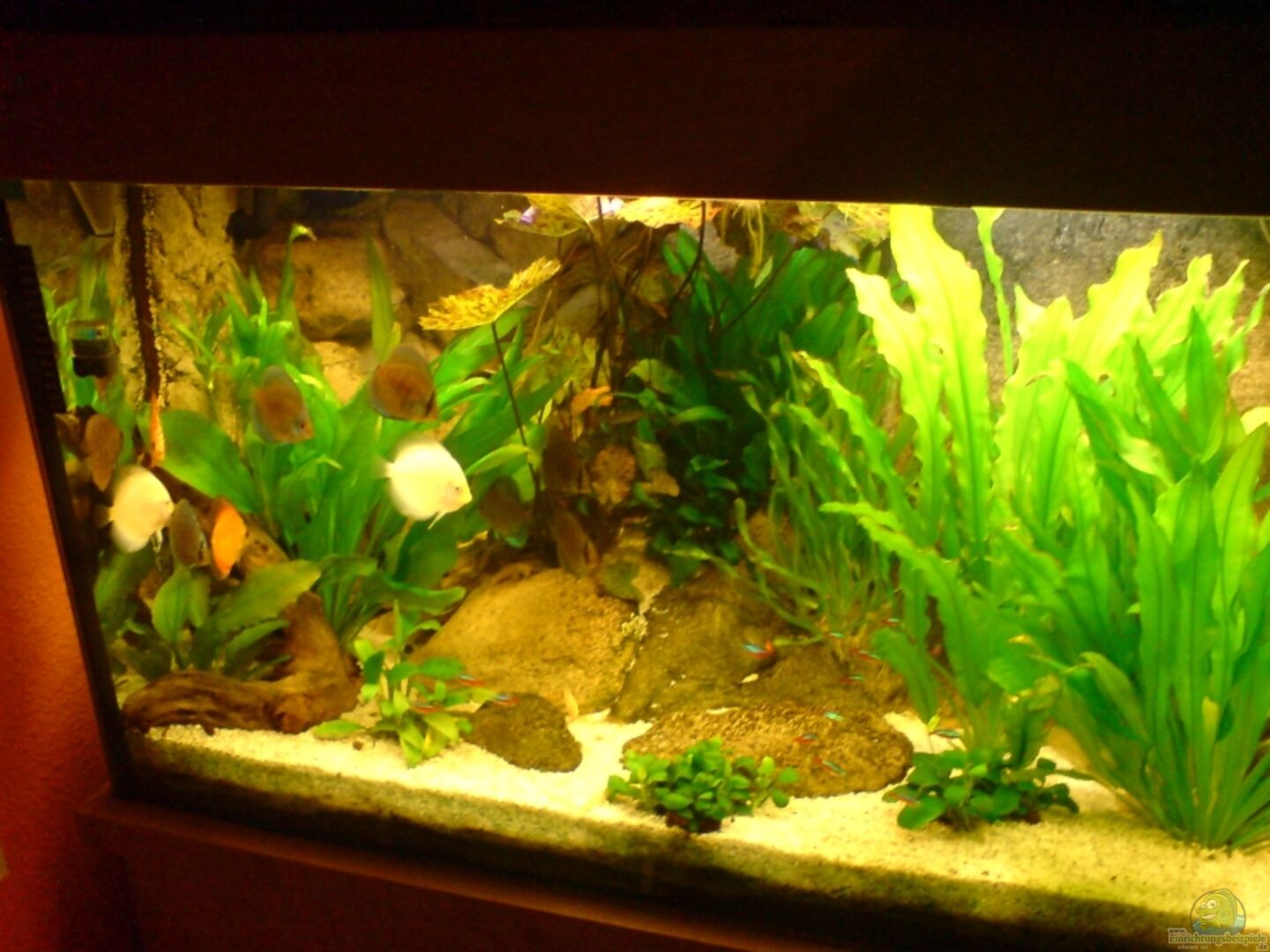 Dieses Becken wurde verkauft, es dient hier nur noch als Einrichtungsbeispiel !!! Es handelt sich um ein Aquarium der Fa. Zoo Zajac in Duisburg. 12 mm Glasstärke, mit schwarzem Silikon auf Stoss verklebt, Sicherheitsnaht. Die Abdeckung / Beleuchtung ist von Aqualux mit 2 x 58W T8. Der Unterschrank ist 4-türig aus 19 mm Spanplatte gefertigt und in der Farbe Buche, die Abdeckung ist ebendfalls in Buche gehalten.