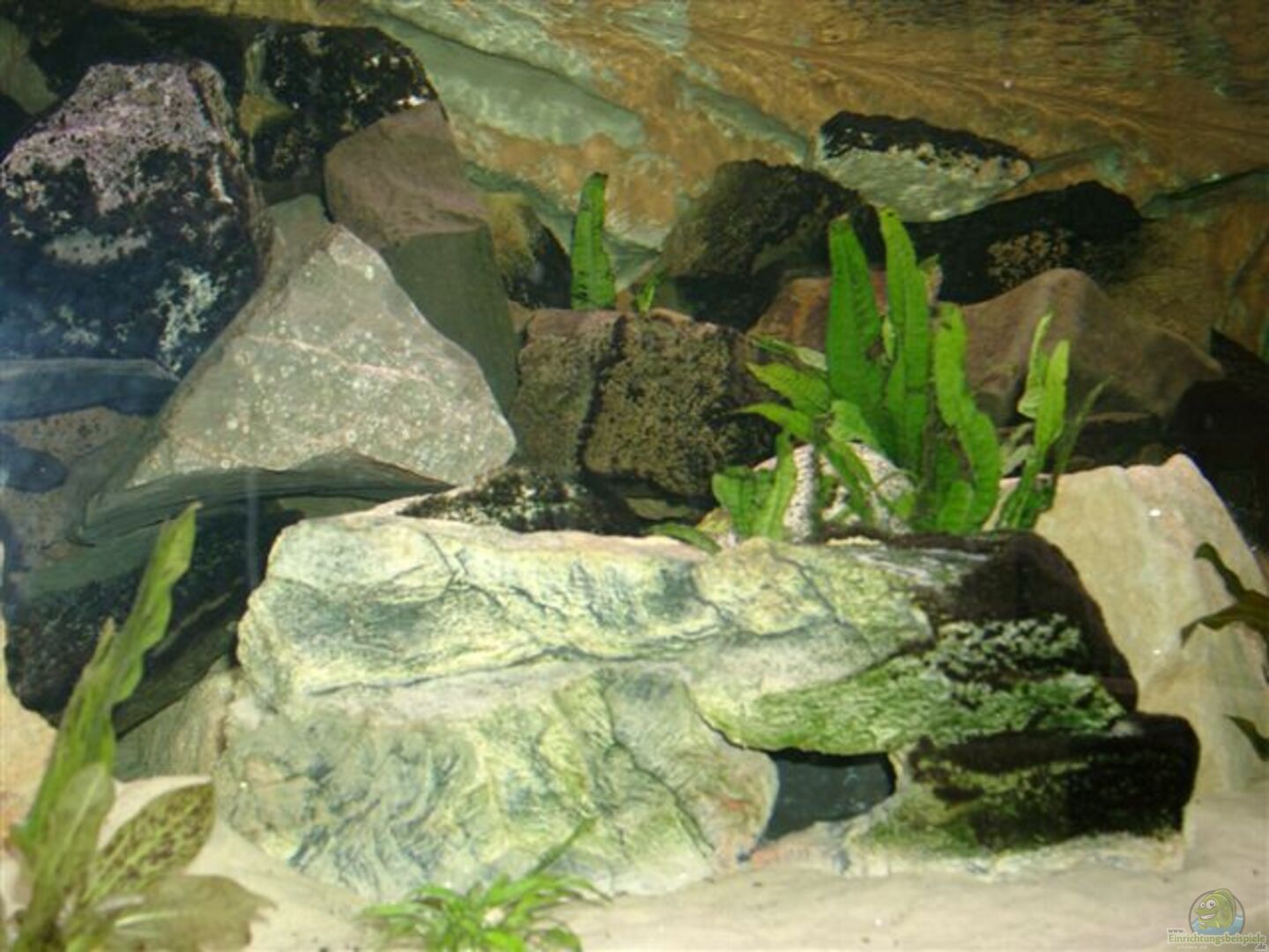 Panguea Rückwand Rocky ca. 200-300 kg verschiedene Steine welche entlang der ganzen Rückwand zu einem Haufen gestapelt sind welcher bis zur Wasseroberfläche reicht