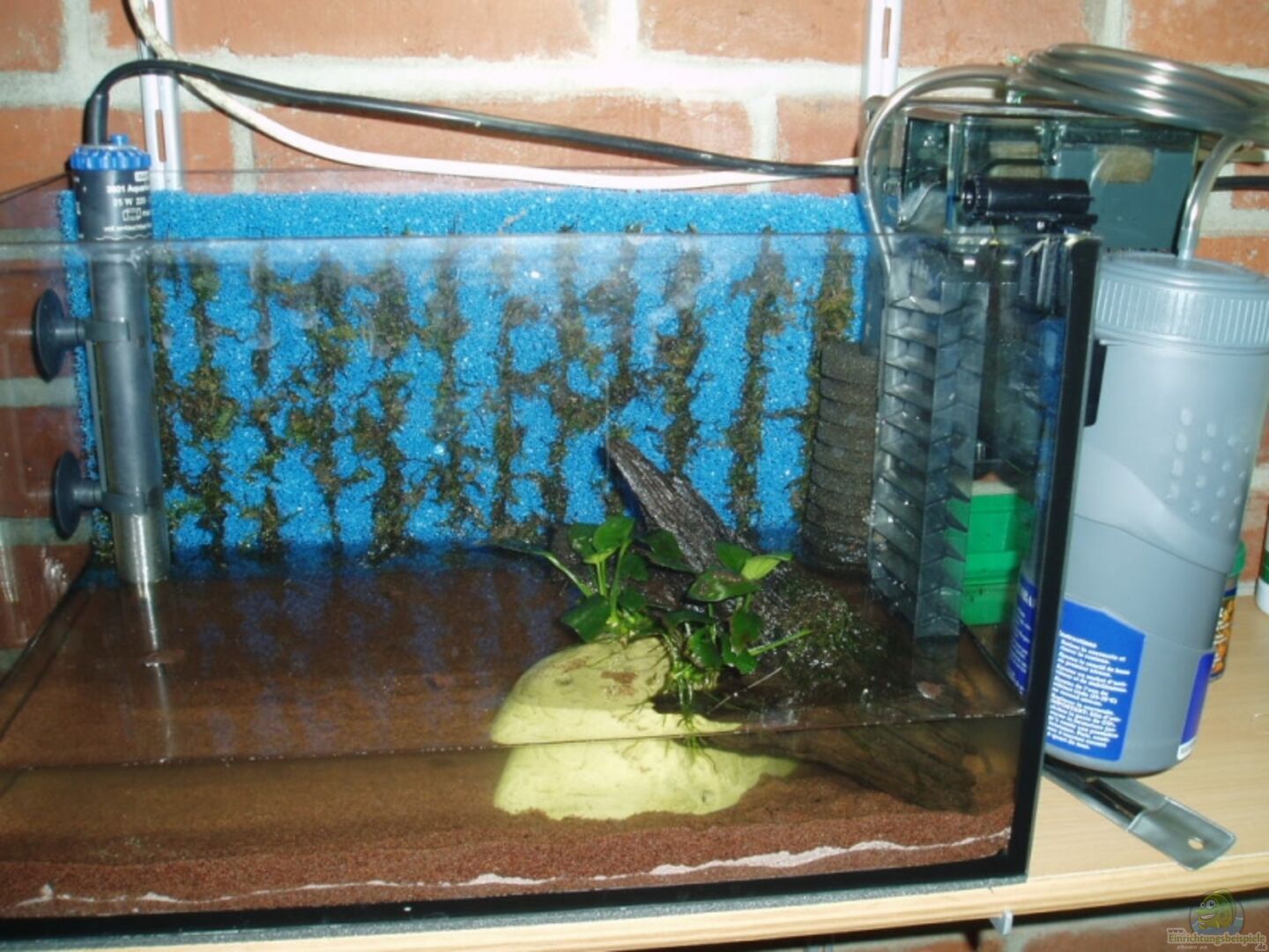 1x Exo-Terra Reptile Cave Small 1x Exo-Terra Snake Cave Small (gefüllt mit Torffasern als Laichsubstrat) 1x Mangroven-Wurzel mit Anubias barteri var. nana und Vesicularia dubyana bepflanzt 1x Hobby Filterschwamm-Matte grob 40x22x3 cm "Bio-Filter-Rückwand" mit Vesicularia dubyana bepflanzt 1x Seemandelbaumblatt als Vorbeugung gegen Laichverplilzung und als Tarnung für den CO2-Flipper und Filteransuagrohr