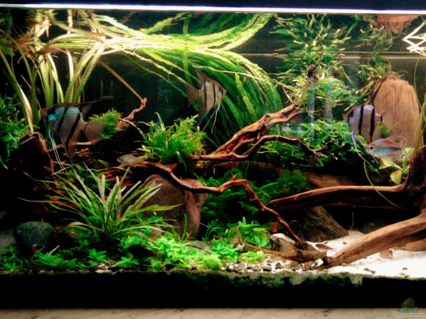 Juwel-Becken, 8 mm Float-Glas, Bodenscheibe 10 cmm Verkleidet von uns mit L-Aluschienen zur besseren Optik auf selbst gezimmertem Tisch, Filter stehen rechts und links