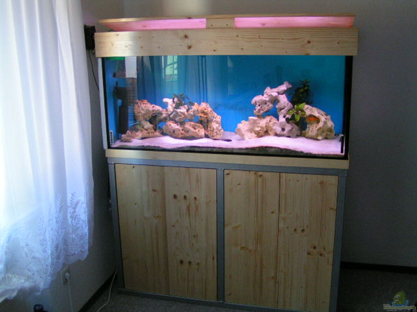 Das Becken ist eine Sonderanfertigung und ist wulstverklebt. Das hat eine Seitenbohrung und ein selbstgem.??berlafschächtchen.Das Becken ist von 4 Seiten mit 3cm. dickem Styropor ausgelegt, um die Wärmeverluste zu reduzieren. Der Boden ist mit 4mm. Pleksyglas auf Silikon ausgelegt. Der unterschrank habe ich aus 40x40x2mm. Vierkantröhr zus. geschweist und lakiert. Der Deckel und die Leuchtbalke sind auch selbstgemacht. Das Becken leuft erst seit einer Woche.