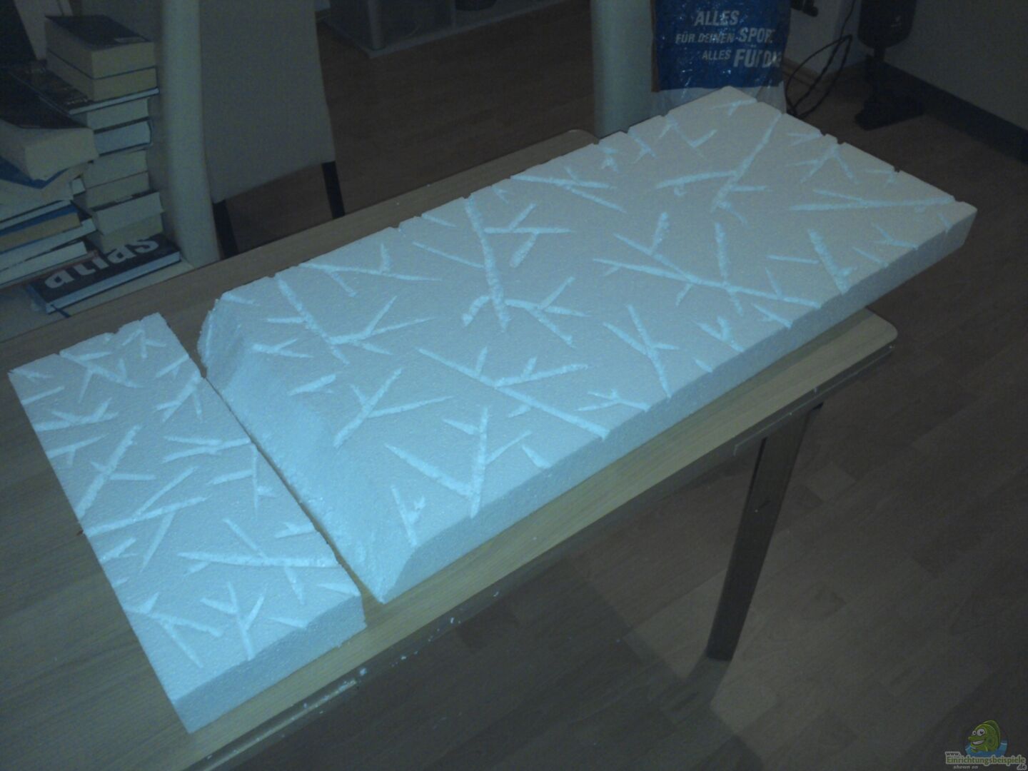 Das Becken hat eine aus Styropor, Fruchtzwergebechern, Fliesenkleber, Graniteffektspray und Epoxidharz selbst gebastelte Rückwand. 3 Wurzeln Eichenlaub halbe Kokosnussschale