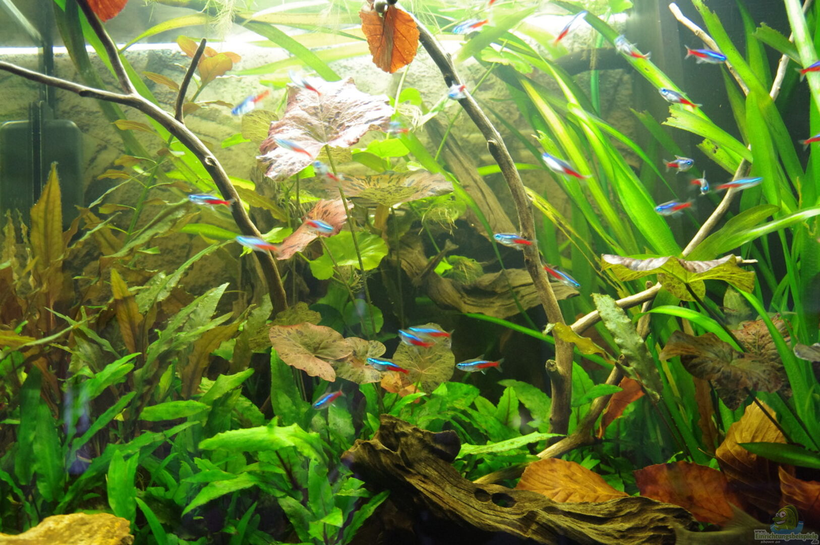 Juwel Lido 120 auf selbst gebautem Unterbau und mit aufgeklebter Fotorückwand "Felsen"