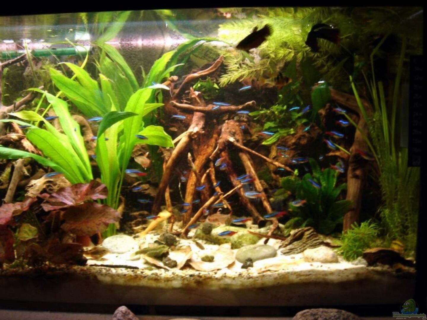 zwei Mangrovenwurzeln in den Ecken vor den Filteransaugrohren zwei gro??e filigrane Moorkienwurzeln in der Mitte jede Menge kleine, filigrane und verzweigte Moorkien-hölzer, -wurzeln und -zweige welche zusammen- und aneinander gestellt wurden um einen tropischen Flu?? mit Fallholz darzustellen. diverse Steine wie Flusskiesel und Pagodensteine viele Tonhöhlen und Röhren und umgedrehte Blumentöpfe als LAichhöhlen für die Welse und Zwergbuntbarsche einige Seemandelbaumblätter