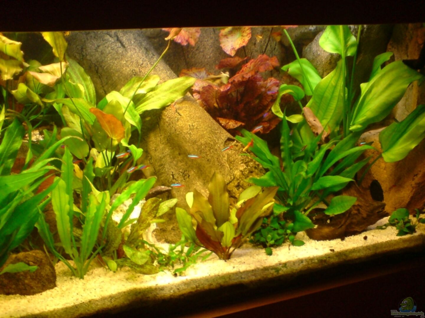 Dieses Becken wurde verkauft, es dient hier nur noch als Einrichtungsbeispiel !!! Es handelt sich um ein Aquarium der Fa. Zoo Zajac in Duisburg. 12 mm Glasstärke, mit schwarzem Silikon auf Stoss verklebt, Sicherheitsnaht. Die Abdeckung / Beleuchtung ist von Aqualux mit 2 x 58W T8. Der Unterschrank ist 4-türig aus 19 mm Spanplatte gefertigt und in der Farbe Buche, die Abdeckung ist ebendfalls in Buche gehalten.