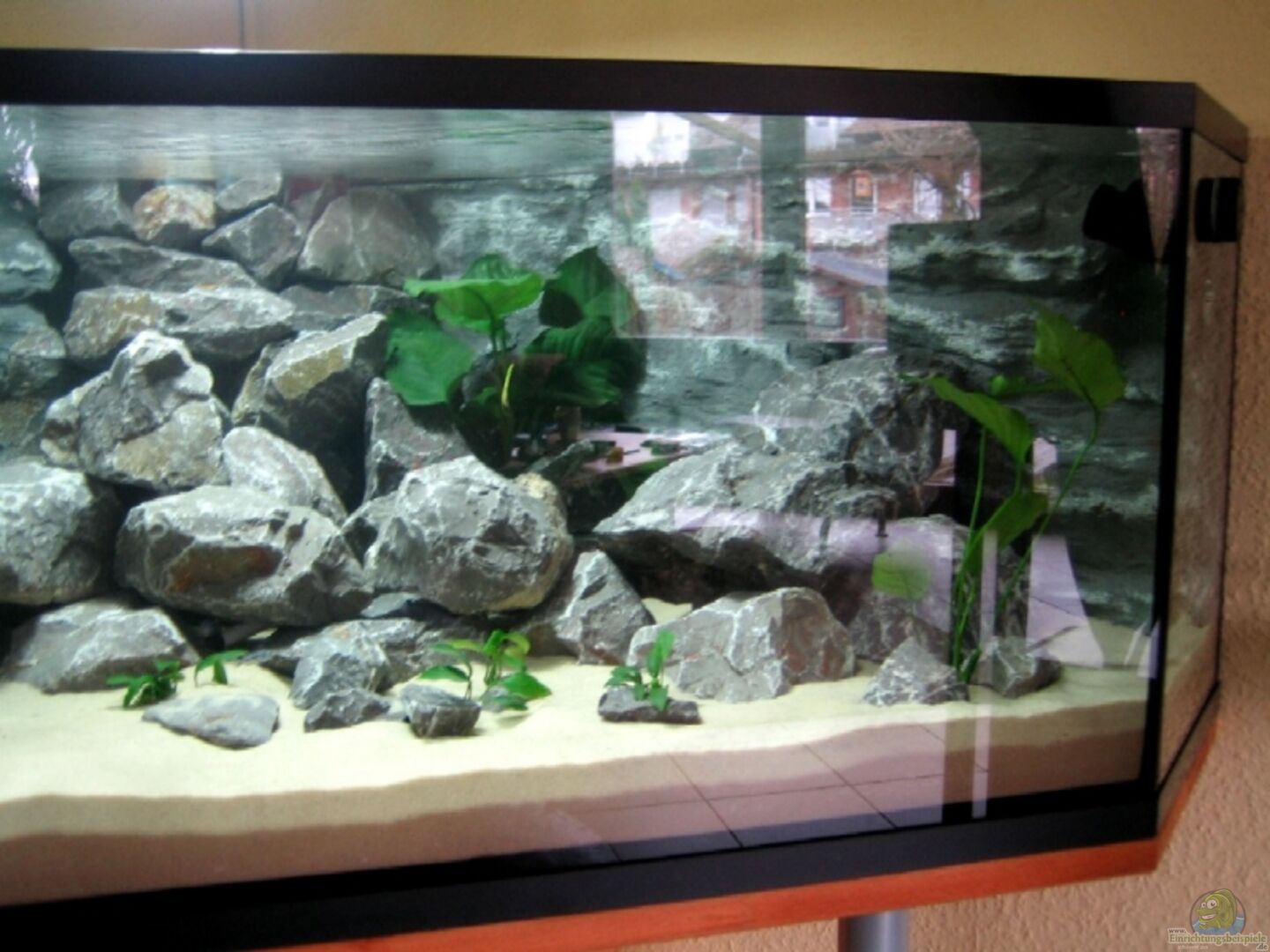 Das Aquarium wurde am 14.01.2008 endgültig geflutet. Von den Brutto 518 Litern Inhalt blieben für das Wasser 330 Liter (gemessen an der Wasseruhr) übrig. Somit werden zukünftig wöchentlich 160 Liter Wasser gewechselt. Es wurden einige Schaufeln ´alter Aquariumsand´ aus einem laufendem Aquarium zum Impfen des Filters hinzu gegeben. Das Becken ist von der Unterseite und den Außenwänden mit 20 mm Styropor gedämmt und nach oben hin offen.