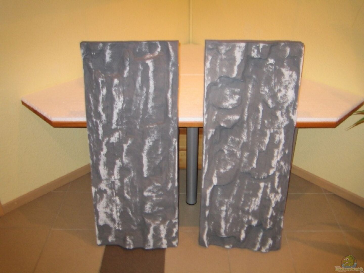 Rückwand aus Glasfaser-Verstärktem-Kunststoff (GFK) mit Acrylfarben gestrichen. Ca. 150 kg Kalkstein.