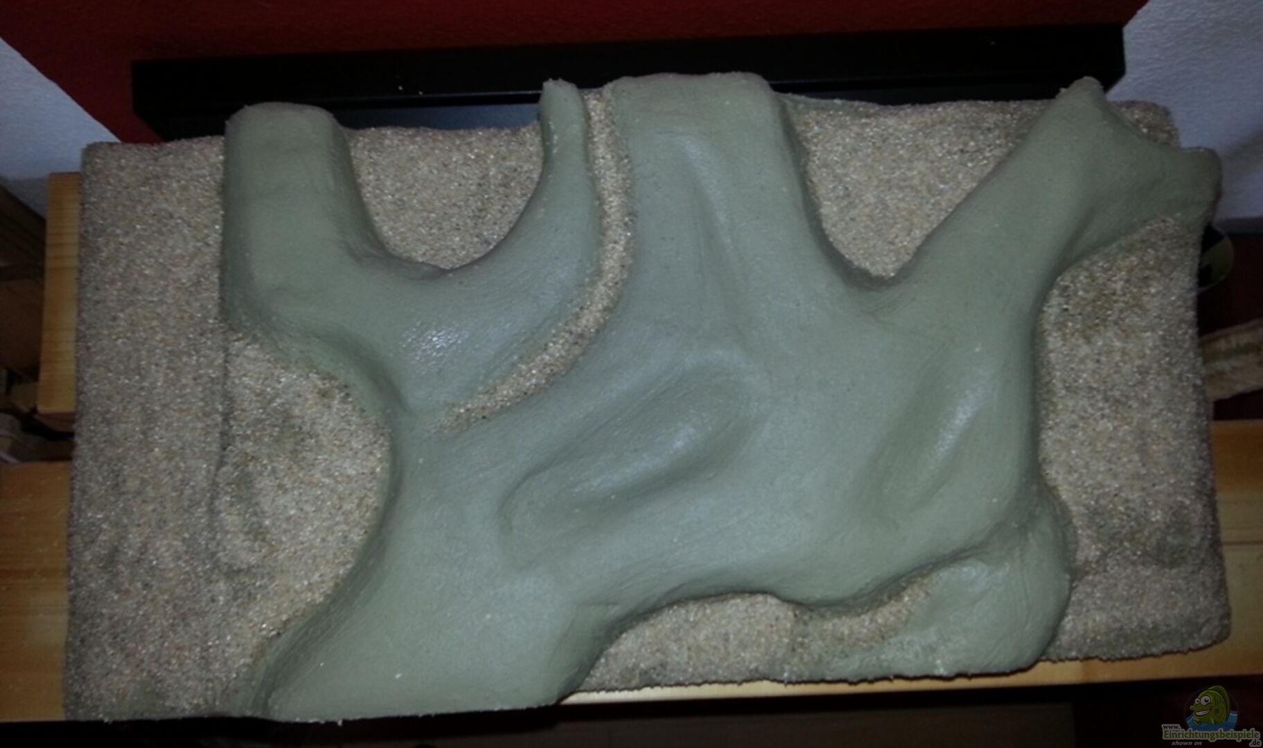 Rückwand selber gebaut mit Höhlen und hinter schwimmbar 2 x Tonröhren 3 x Wurzeln 1 x Lochgestern