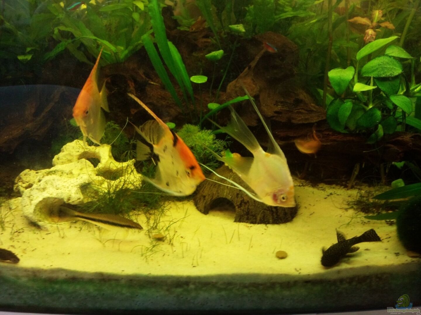 2x Pterophyllum scalare Diese beiden Tiere sind ein Paar aus einer Gruppe von anfänglich 8 Jungfischen 4x Trichogaster trichopterus (Goldfadenfisch) (1/3) 2x Ancistrus (brauner Antennenwels) 1x Ancistrus (Antennenwels Albino) 10x Corydoras melini (Kopfbinden-Panzerwels) ca 13x Hasemania nana (Kupfersalmler) 12x Cheirodon axelrodi (Roter Neon) 1x Apfelschnecke (Ampullariidae)