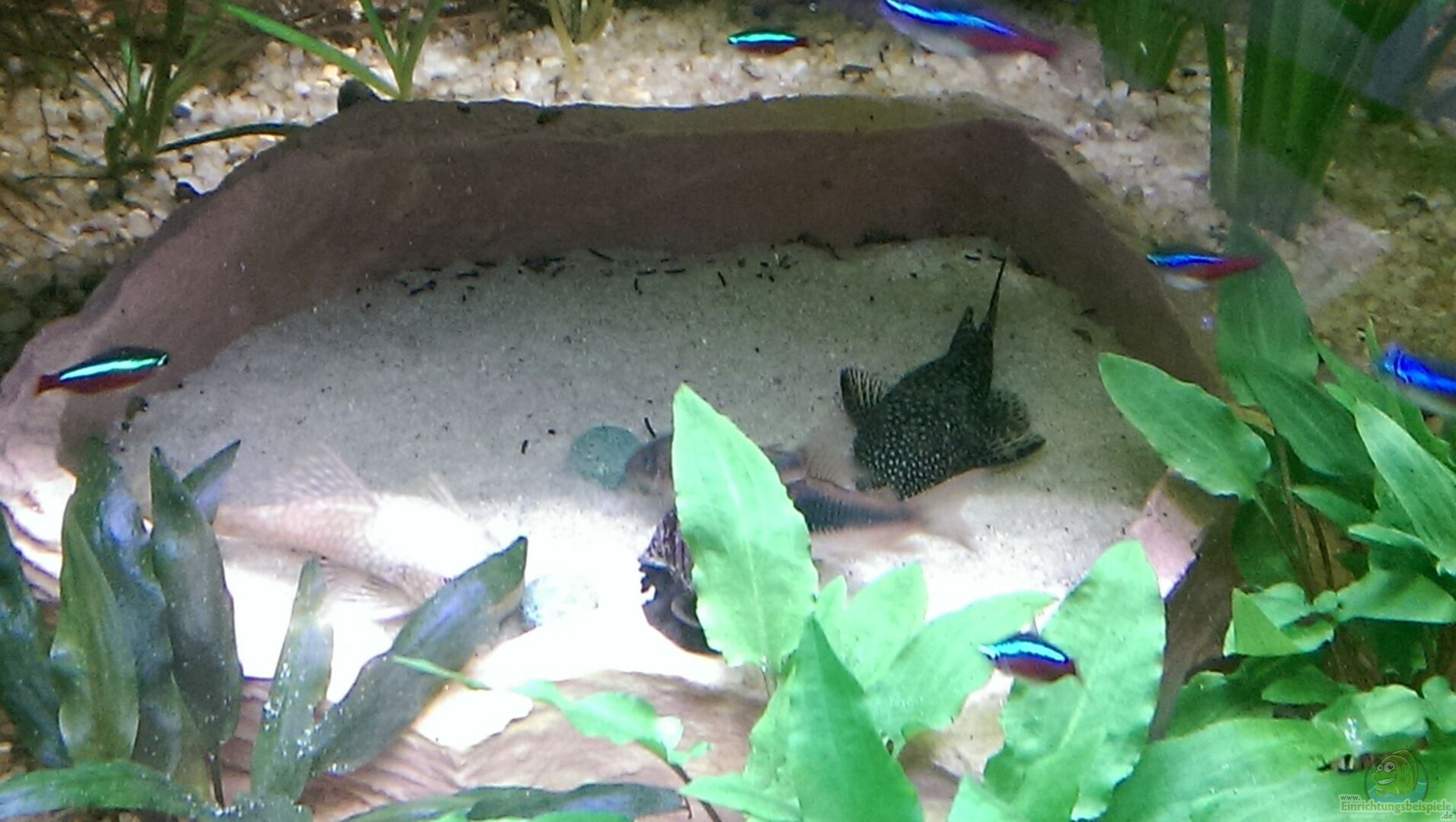 Vier verschieden grosse Morkienwurzeln, versteinerte Wurzeln, zwei Tonröhren, eine Wasserschale aus Kunststoff in Felsoptik(befüllt mit Sand für meine Corys), eine Kokosnusshöhle, eingeklebte Rückwand aus Ton, versteinertes Holz. 15.02.2015 Noch einige Tonröhren hinzugefügt, für die neuen Mitbewohner(3xL333).