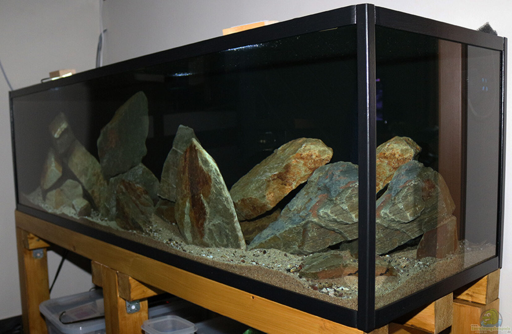 Bruchstein ca. 160 kg (nicht alle haben es ins Becken geschafft) Es wurden Handelsübliche Bruchsteine gekauft, die auch im Teichbau benutzt werden, diese sind in verschiedene Grö??en (bis 15 bis 40 cm) und haben Natureinschlüsse. Beim "dekorieren" wurde ein Glasschutz unter den Steinen gesetzt und besonders darauf geachtet, das genügend Möglichkeiten zur Revierbildung vorhanden sind. Alle Fische können aus dem Sichtfeld verschwinden/ sichverstecken, was uns sehr wichtig [...]