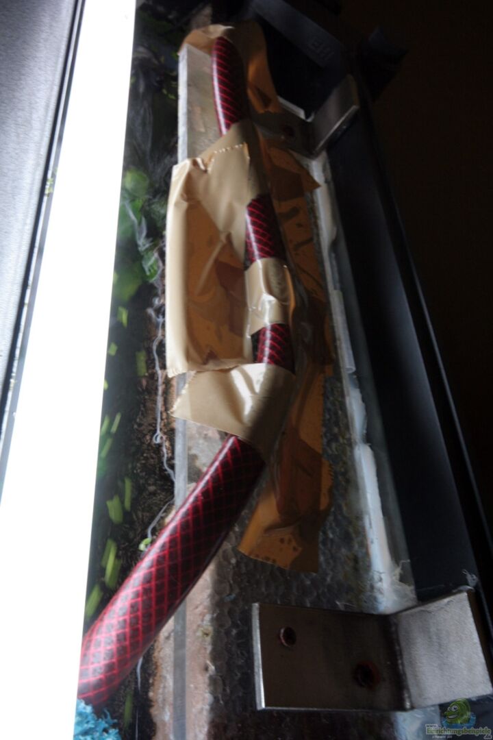 Jäger Heizstab für Aquarien bis 300Liter Eine Strömungspumpe, die 600Liter die Stunde pumt, wurde mit einem Schlauch in die Mitte des Aquariums gelegt. Die Pumpe kommt aus dem Innenfilter eines Juwel Rio 180.