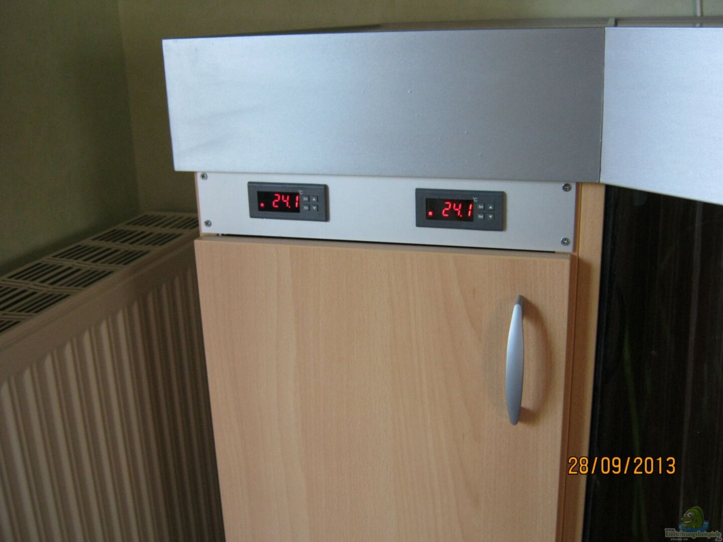Denerle Bodenfluter 75W Heizstab 300W Der Heizstab befindet sich hinter dem Mattenfilter. Geregelt werden die Heizungen über zwei externe Thermostaten, d.h.: der Thermostat für die Bodenheizung ist auf 27° eingestellt, das Thermostat für den Heizstab auf 25°. Der Heizstab selber ist auf 26° eingestellt. Abends, ca. 15 Minuten nach dem das Licht aus ist wird die Regelung des Heizstabes über eine Schaltuhr auf den externen Thermostaten umgeschaltet und Morgens dann, kurz bevor die [...]