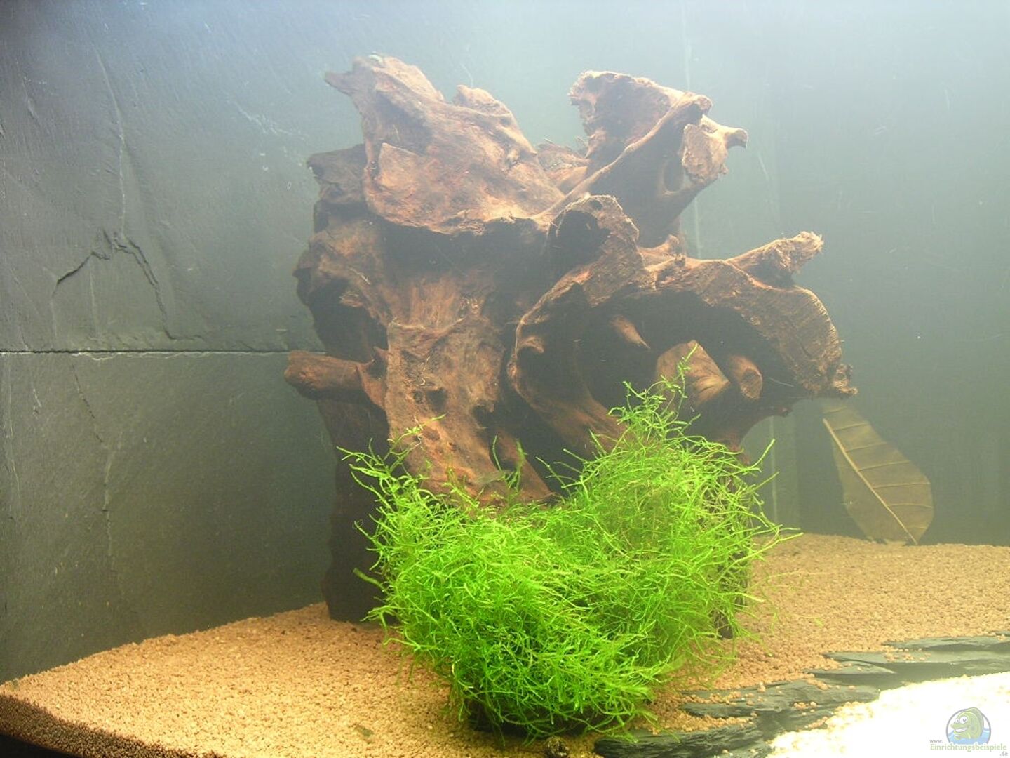 Schieferplatten; Bodenfliesen aus dem Baumarkt mit Aquarien-Silikon an die Scheiben geklebt. Schieferplatten; von einer Baustelle. Offenbar eine bessere Qualität, als die vom Baumarkt, da die Bruchkanten deutlich natürlicher zerplittert sind. Aus diesem Material ist die Terasse und eine Höhle im Vordergrund gebaut. 1 Moorkinholzwurzel 1 künstlicher "Felsen", innen mit Kunststoffplatten in ca. 8 Höhlen aufgeteilt. Wird demnächst entfernt und durch eine Mangrovenwurzel [...]