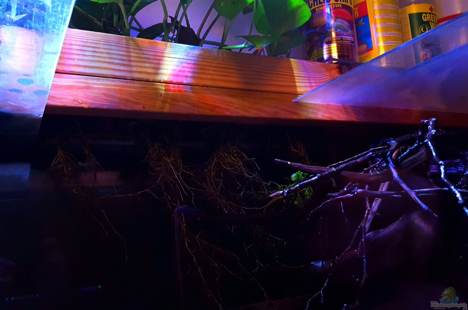Schwimmkraut (Hornkraut) 1x Tigerlotus (Schattenspender ???) Efeutute über dem Becken. Dafür habe ich mir eine Konstruktion ausgedacht und angefertigt (siehe Bilder Aquarium). In diese Konstruktion kann ich mit Hilfe von einfachen Teich Pflanzen Körben die Efeututen über dem Becken platzieren, so dass nur die Wurzeln ins Wasser hängen. Diese haben den Vorteil das sie zusätzlich Nitrat aus dem Wasser ziehen und der andere positive Effekt ist das die Wurzeln sich ihren Weg durch die Unterwasser [...]