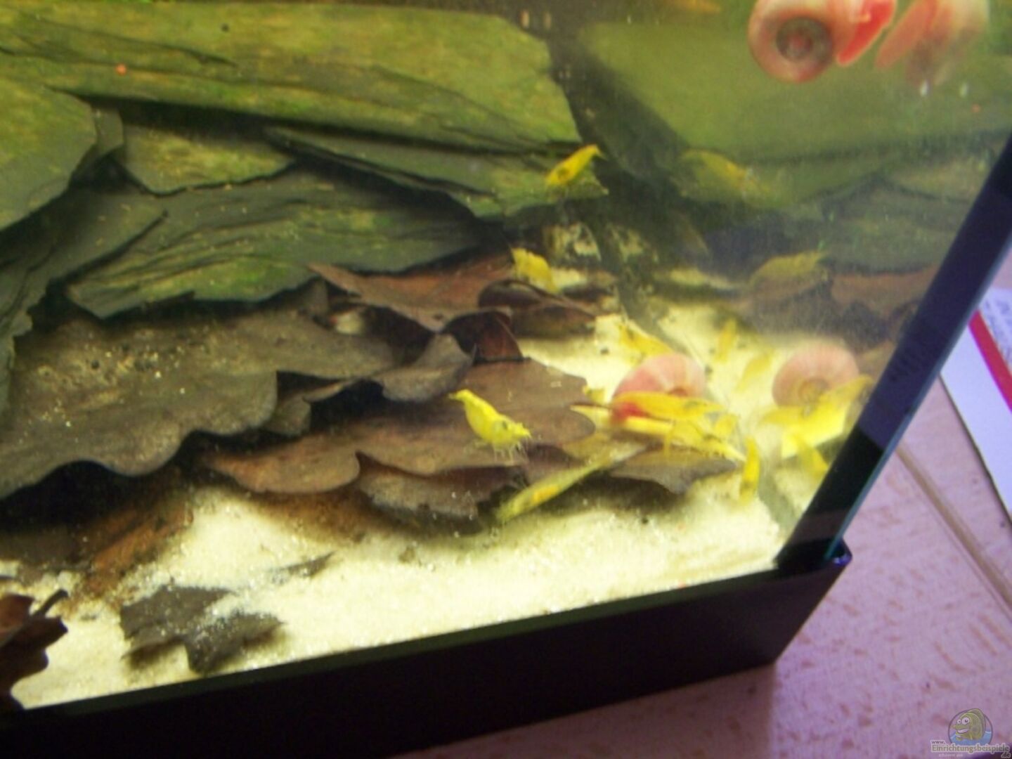 - 15 Yellows ( Neocaridina heteropoda ´Yellow´ ) --> aus den 15 Yellows sind mitlerweile ( mit Nachwuchs und kauf ) ca. 80 geworden und sie vermehren sich fröhlich weiter( 16.09.08 ) -- 8 rosa Posthornschnecken ( mitlerweile sinds sicher 100000 :D )