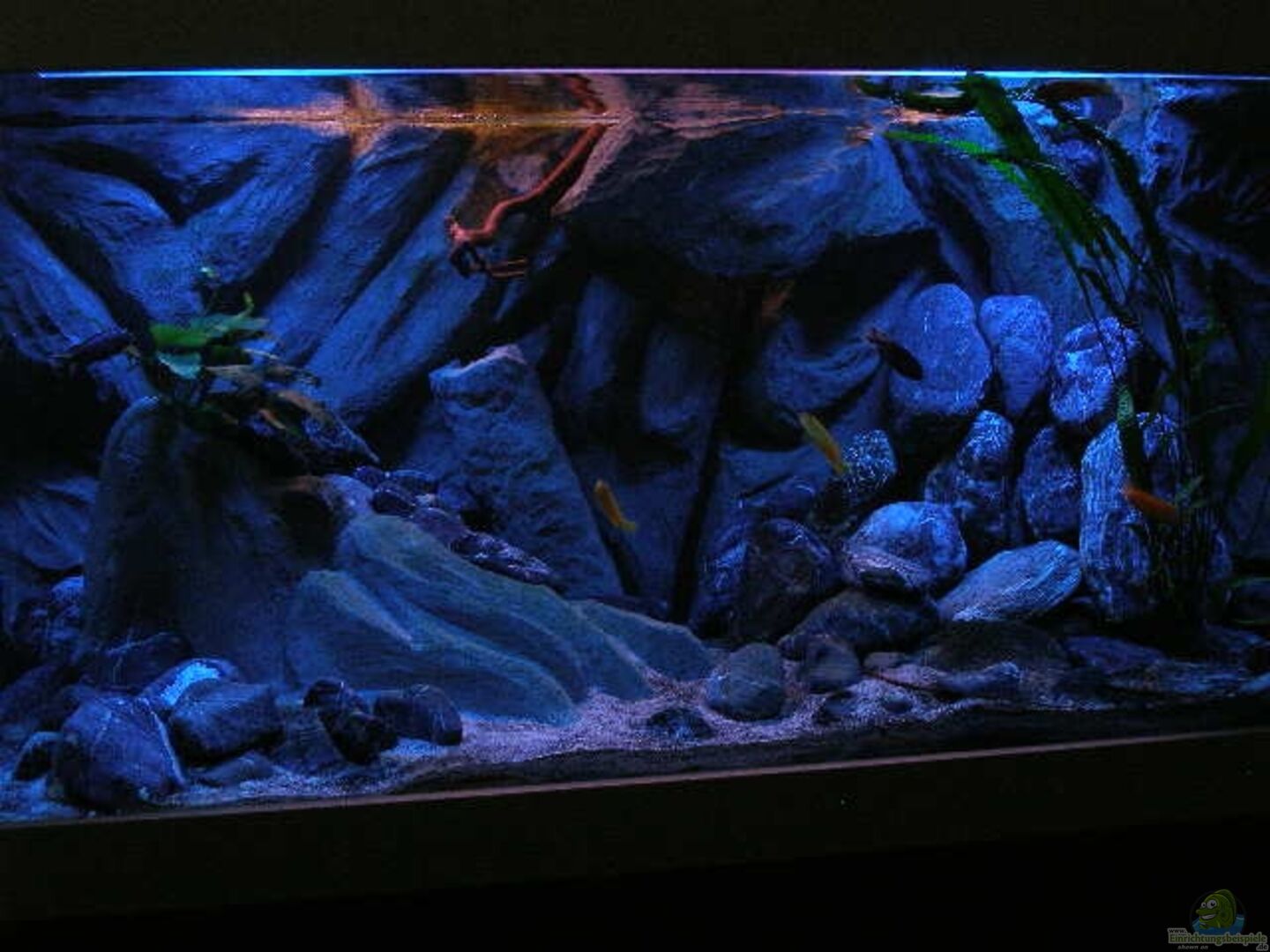Selbstgebaute und zum Teil hinterschwimmbare Rückwand. Ziel war es, eine Rückwand zu gestalten die ziemlich Naturnah ist, und den Ansprüchen der Fische entspricht. Als Motiv diente ein gemachter Ausschit aus dem Video "Fastzination Malawiesee". Diese war wirklich nicht einfach zu gestalten, aber unterm Strich denke ich, dass es uns einigerma??en gut gelungen ist. Bisher hat sich aber noch keiner beschwert. ;-) Steine (aus dem Baumarkt) etwa 20KG