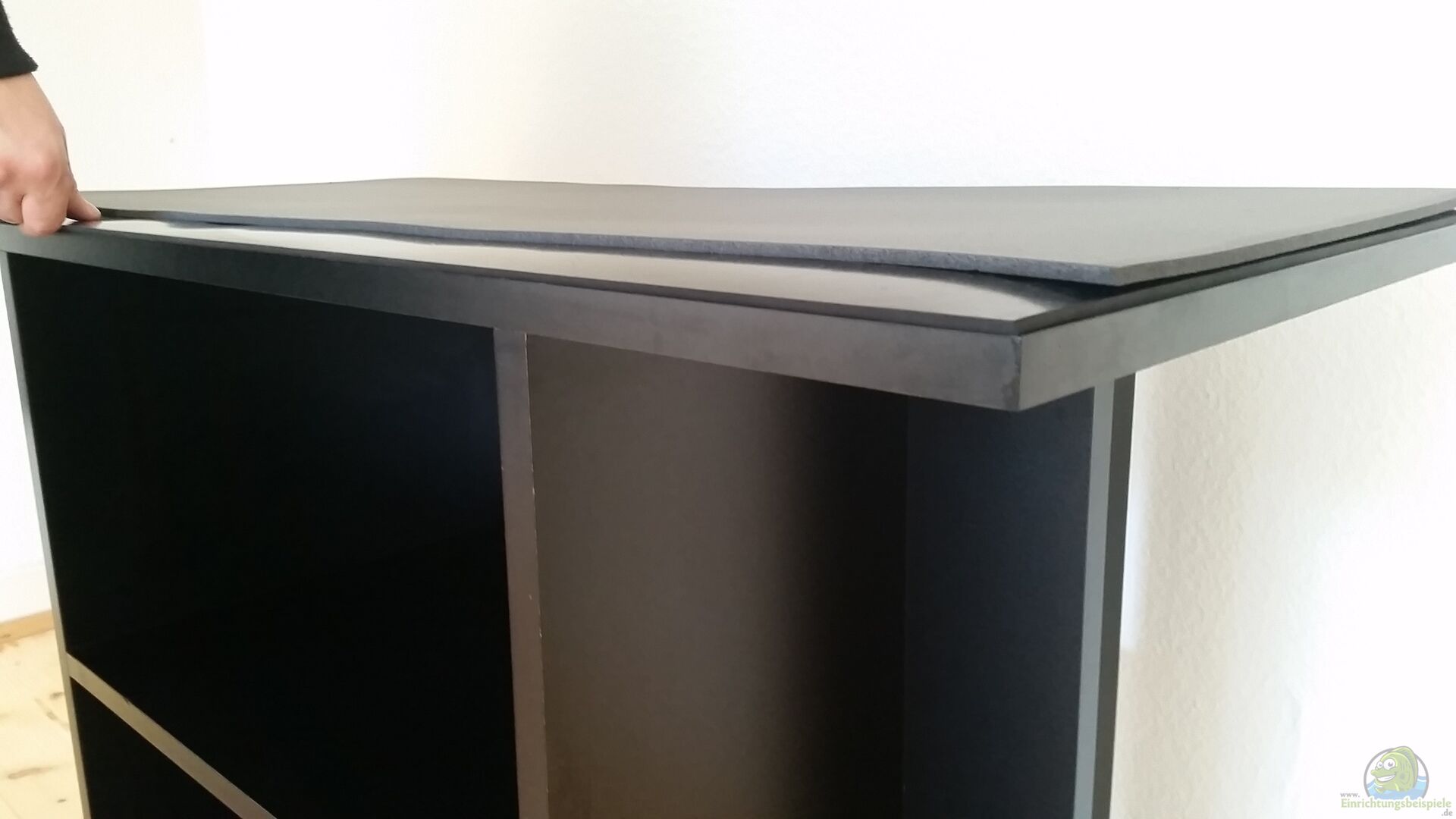 Die Rückwand besteht aus einer simplen Styroporplatte, welche ich schwarz besprayed und dann hinter dem Glas befestigt hatte. Ich musste zum Glück nichts leimen, da die Platte durch die Schläuche am Glas gehalten werden. Da die Platte hinter dem Glas sind verliere ich keinen Platz im Becken, muss mir keine Sorgen um eingeklemmte Tiere oder um Giftstoffe machen.