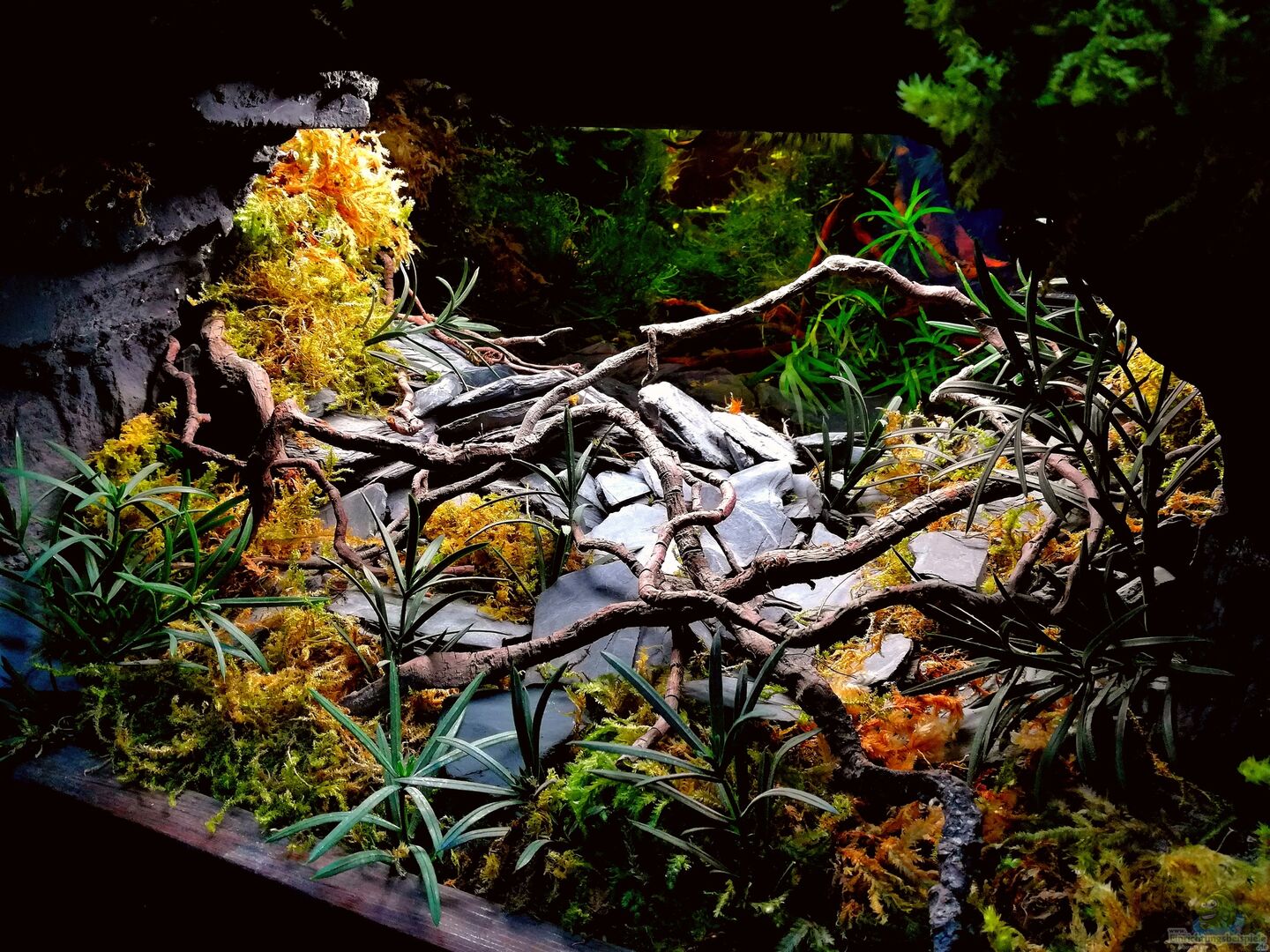 Die Besonderheit bei diesem Aquarium ist das blaue Loch in der Mitte. Man schaut durch das Becken hindurch in den Kellerabgang. Die gegenüberliegende Wand entlang der Kellerstiege wurde mit einer passenden Fototapete versehen. Der Boden der Mauer vom Durchbruch ist mit einem Diorama verschönert, mit Moos aus dem Wald, Holz, Schiefersteinen und passenden Plastikpflanzen. Durch diesen optischen Trick, glaubt man, dass dieses Becken extrem tief hinein führt. Das Ganze hört aber in Wirklichkeit schon [...]