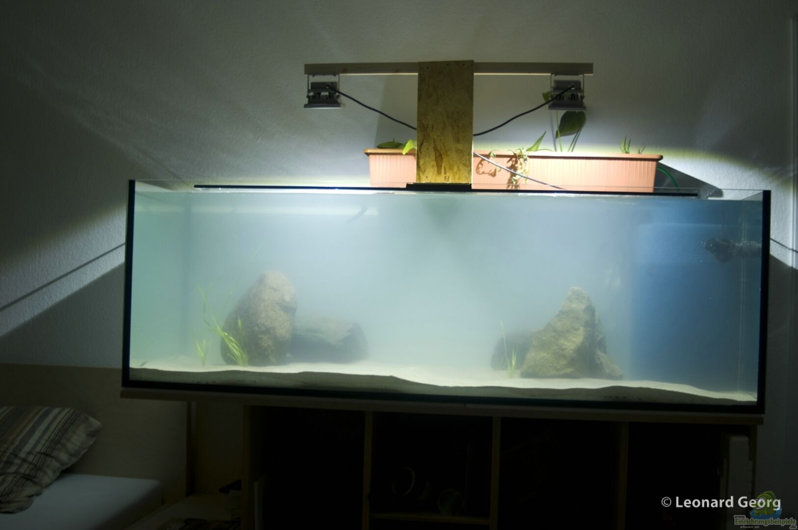 Zur Biologischen Filterung und um möglichst viele Nährstoffe aus dem Becken zu ziehen, habe ich oben auf dem Becken einen Balkonkasten mit Lavakies gefüllt. Dieser ist mit verschiedenen Pflanzen besetzt wie Efeutute, Grünlilie und Monstera.