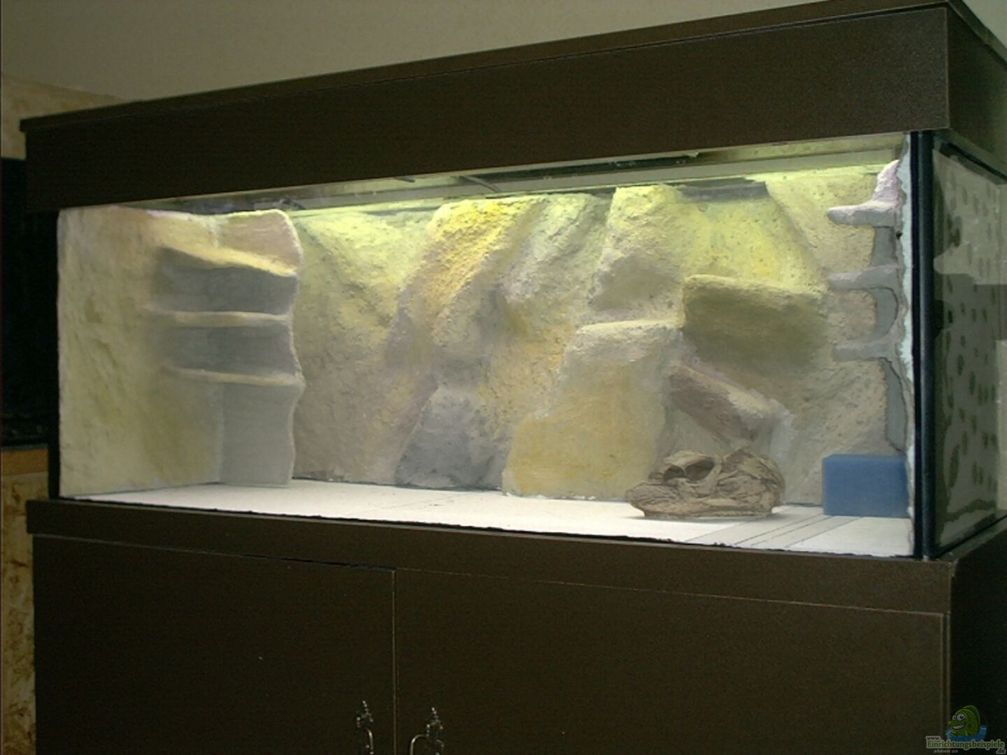 Rückwand und Seiten Selbstbau aus Styropor und Estrichzement, eingefärbt mit Abtönkonzentrat für Wanddispersionsfarbe. Nachbehandelt mit 2 Kommponenten Epoxiedharz 2 mal Gestrichen. Gewässert 14 Tage und mit Aktivekohle gefiltert. Bruchnatursteine Braun-rötlich