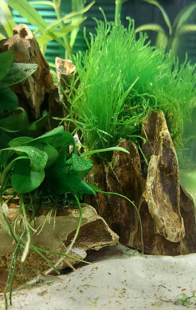 Folgende Pflanzen sind an die Drachensteine geklebt: (mit NatureHolic Sekundenkleber, unschädlich für alle Bewohner) - Anubias nana - Javafarn - Teichlebermoos - Flammenmoos