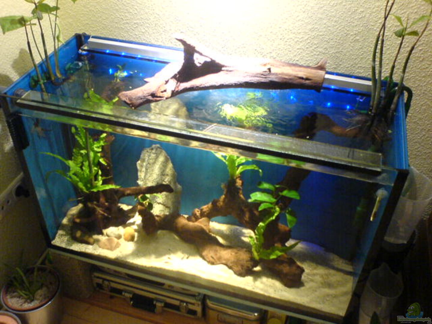Ist eigentlich mein Altes Osmosewasser-reife-becken, Rückwand u.Seitenscheiben sind mit blauer Abtönfarbe gestrichen, vorne links (linke seitenscheibe bohrung von altem Osmosewasser-zulauf) Sonderanfertigung 10mm