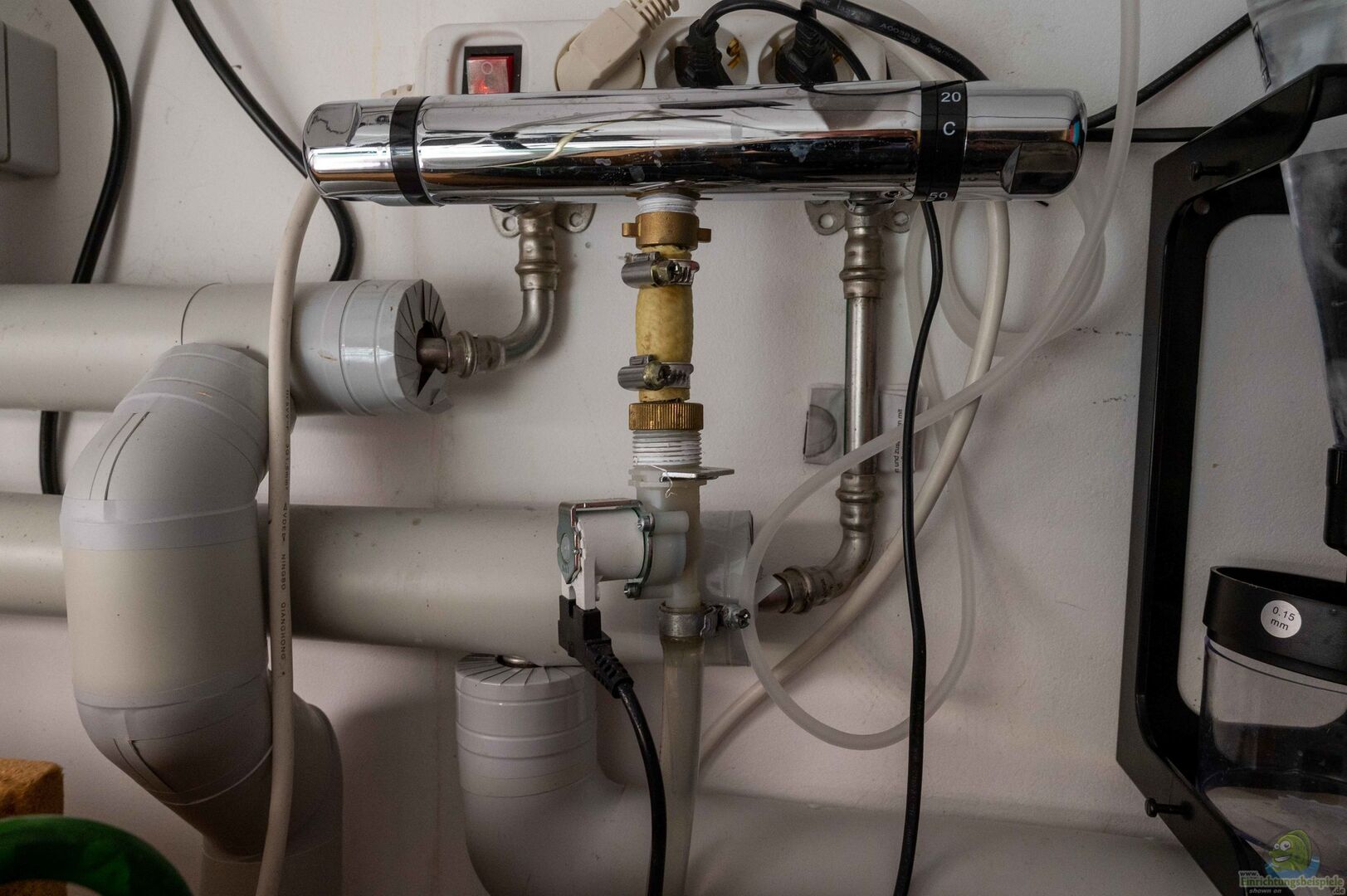 Automatisierter Wasserwechsel durch eine Duscharmatur direkt neben dem Aquarium, geregelt per zeitgesteuertem Waschmaschinenventil, ca. 120 l am Tag. Diese Wasserwechsel erfolgen 2x täglich zu je 60 l mit ca. 25-30 °C warmem Leitungswasser und machen den elektrischen Heizstab (300 W) in 80 % des Jahres arbeitslos. Temperaturregelung: Conrad Thermoschalter.